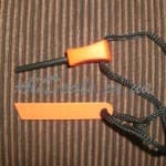 Ручка огнива пластиковая, ярко-оранжевого цвета, как собственно и комплектное кресало. К слову, в мокрых руках ручка не скользит, а искры можно высекать даже обухом ножа. Кстати, для того чтобы не потерять кресало, оно привязано к огниву при помощи обычного шнурка.